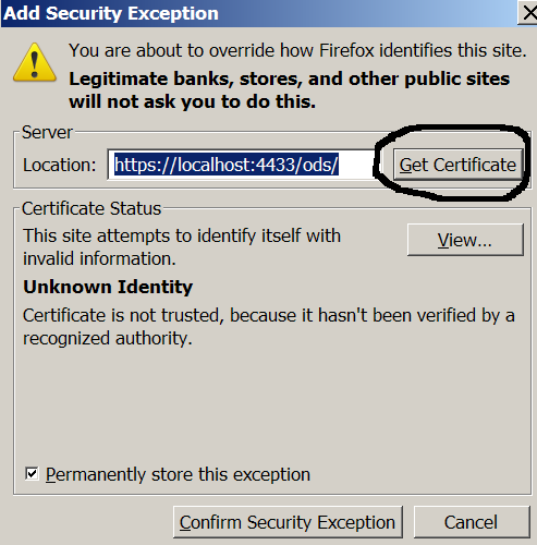 2. In Firefox certificate manager, Site's certificates add an exception: Firefox Tools -> Options -> View Certificates -> Servers -> Add Exception,