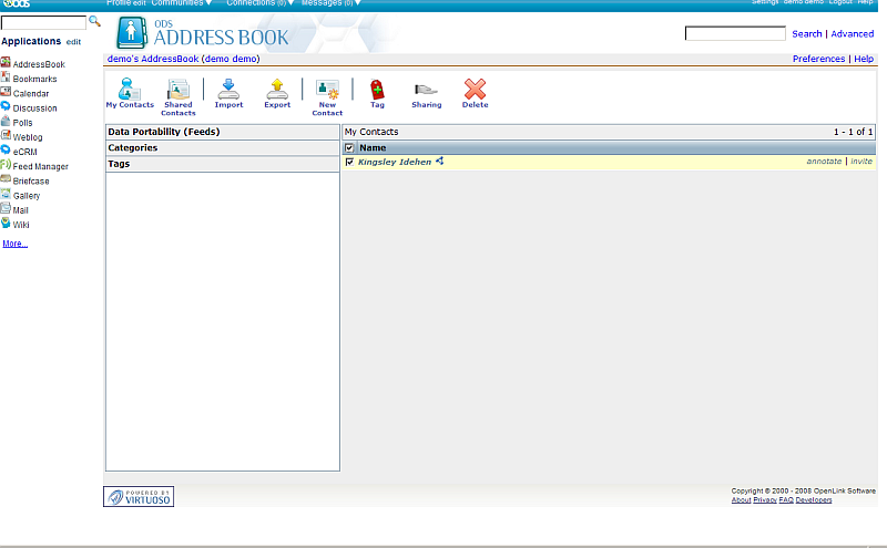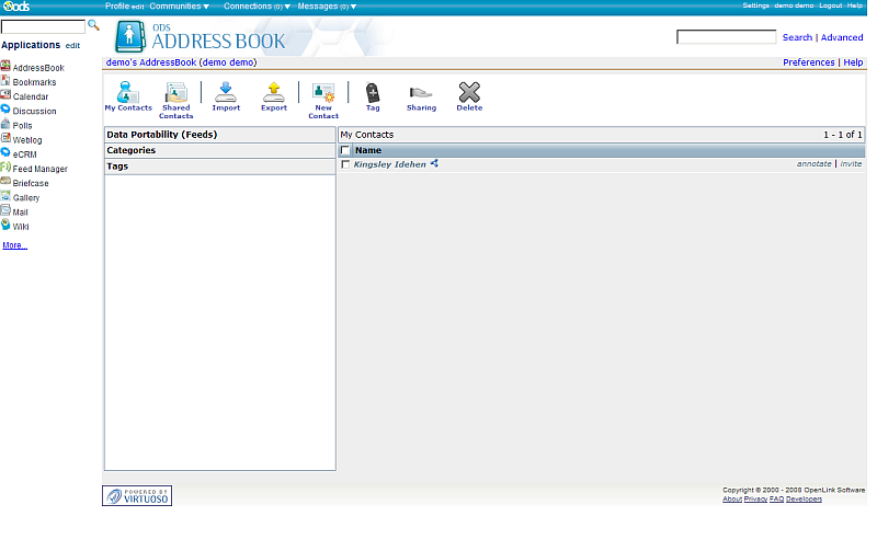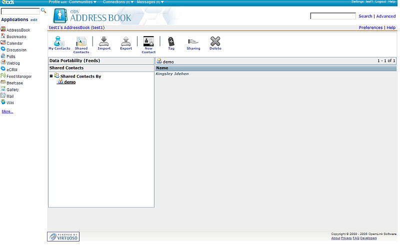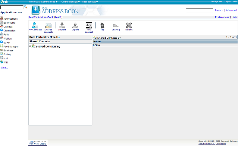 - As result in the 2nd pane will be shown the shared contacts from user demo to the logged in user test1.