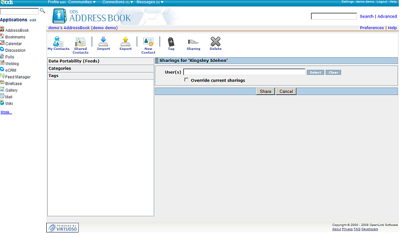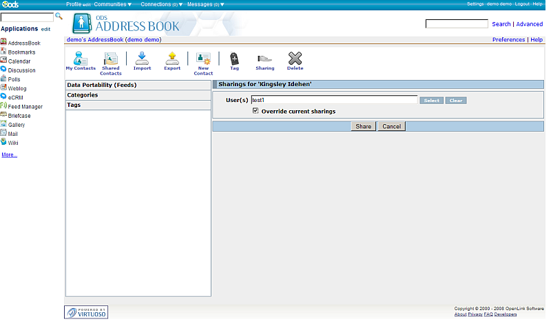 ODS Addressbook offers the feature for sharing contact(s) to other user in the relevant ODS dataspace. Here is a sample scenario: