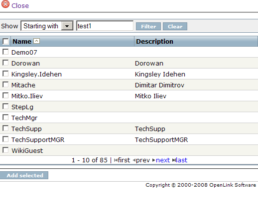 - For ex. if you click the "Select" button, will be opened new window with the list of the ODS registered users. Select directly user(s) or make filter. In our example we will select the test1 user.