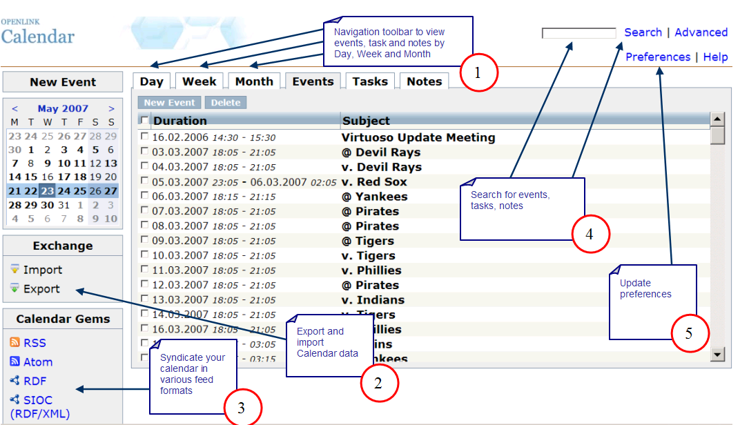 - Use Navigation toolbar to view events, task and notes by Day, Week and Month