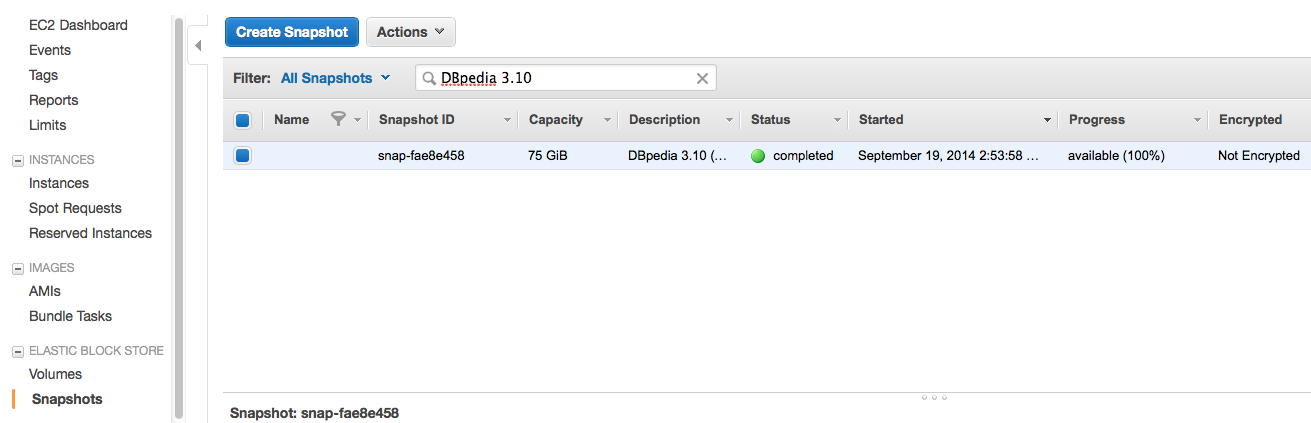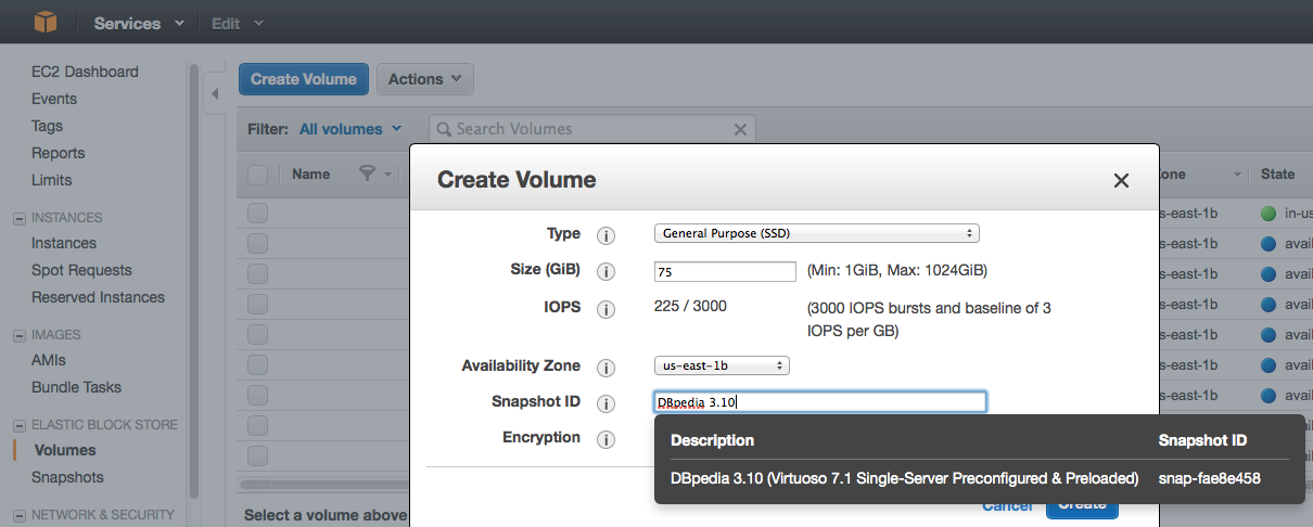 4. Click on the "Create Volume" button and set "Size" to 75GB, "Availability Zone" to match the zone of your running Virtuoso EC2 AMI instance and "Snaphot" to the required DBpedia AWS snapshot i.e. DBpedia 3.10.