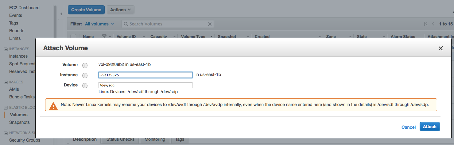 6. Select the "Instance" and "Device" to which the volume should be attached, and click "Attach"