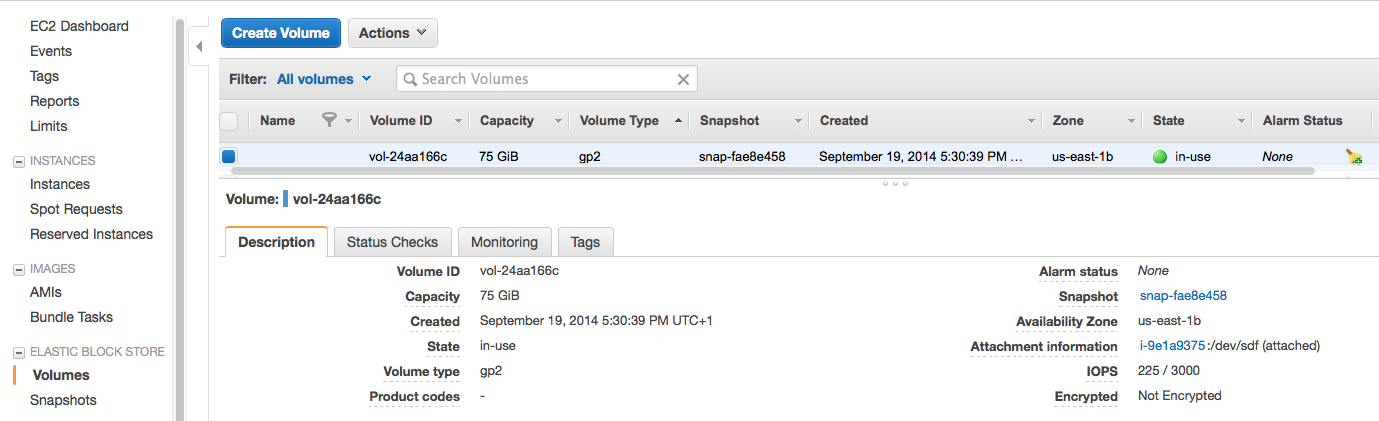 7. The volume will now be listed as "attached" to the specified Virtuoso EC2 AMI instance id.