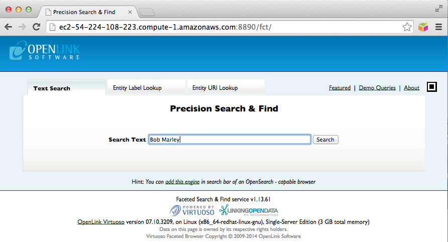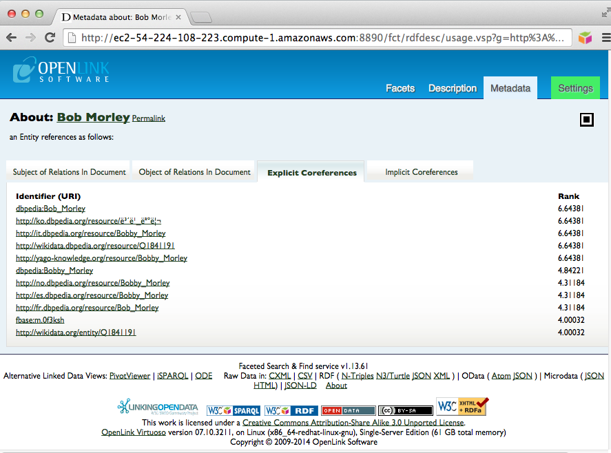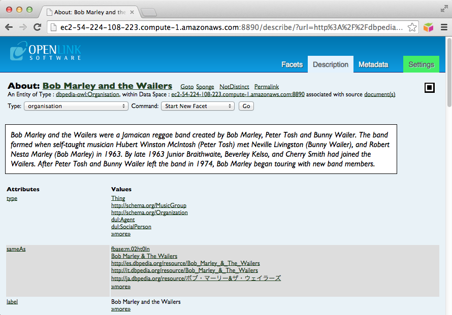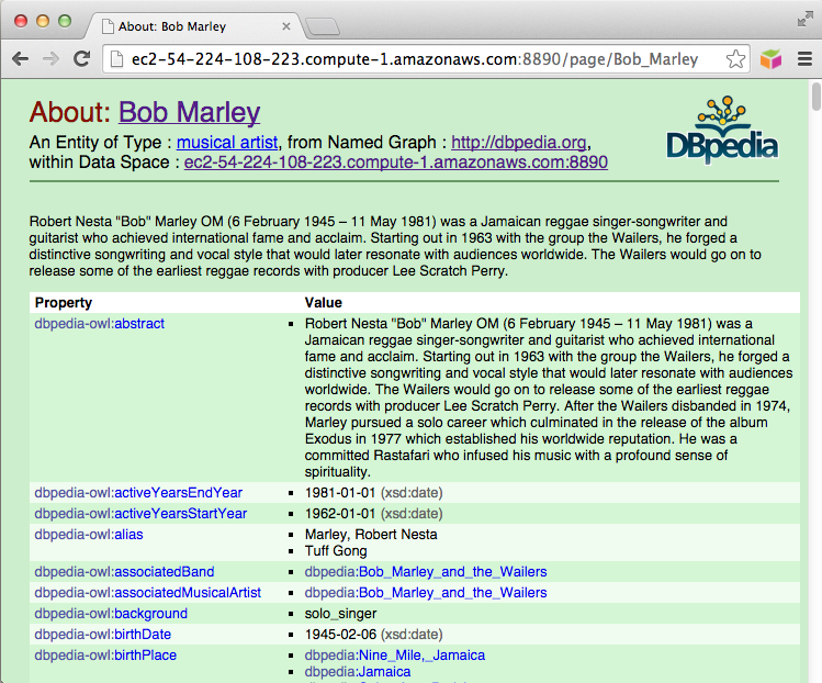 • A description of the resource Bob Marley can be viewed as: http://ec2-ami-public-dns-cname:8890/resource/Bob_Marley