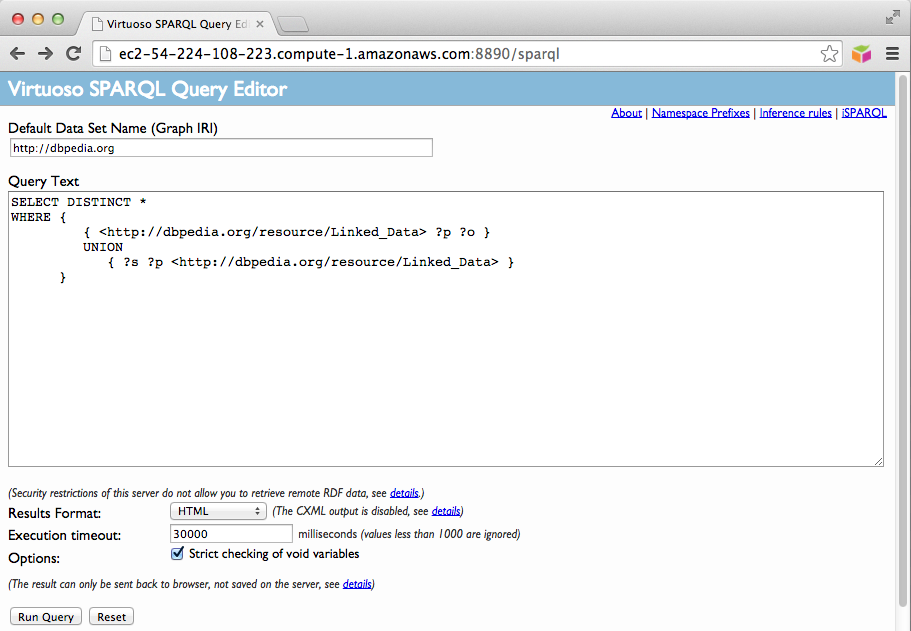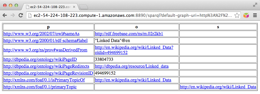 • A SPARQL query can be run to obtain information on a resource at http://ec2-ami-public-dns-cname:8890/sparql