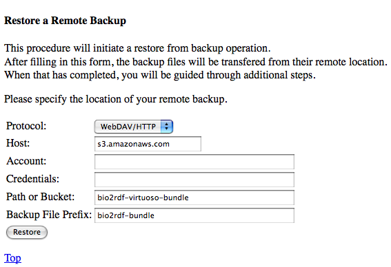 Protocol: WebDAV/HTTP Host: s3.amazonaws.com Path or Bucket: bio2rdf-virtuoso-bundle Backup File Prefix: bio2rdf-bundle