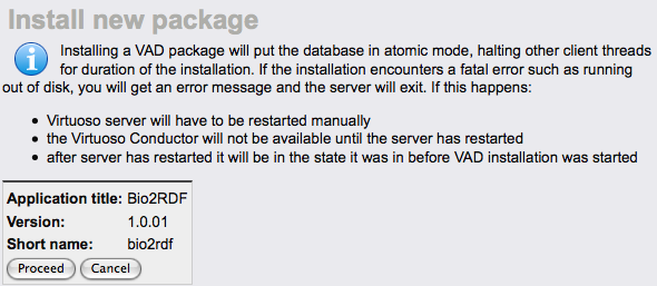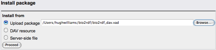 bio2rdf_dav.vad) package. - Navigate to the "System Admin" -> "Packages" tab of the Virtuoso Conductor.