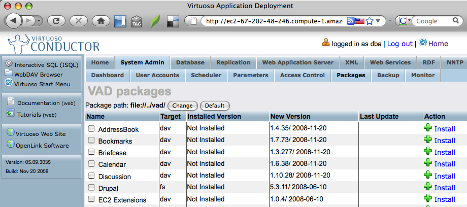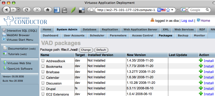 - From the Virtuoso Conductor, navigate to the "System Admin" -> "Packages" tab to obtain a list of available Virtuoso packages (VADs) to install.