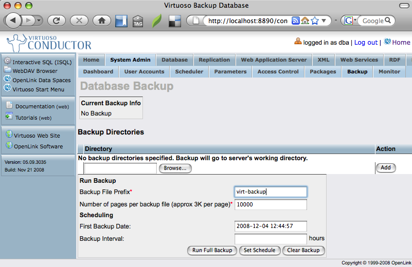 - Select "System Admin" -> "Backup" Tab of the Virtuoso Conductor, set the "Backup File Prefix" to the name each backup file name should be prefixed with and click the "Run Full Backup" button to create an initial backup set.