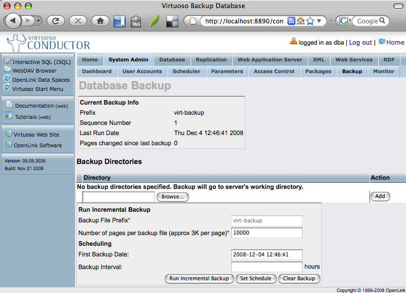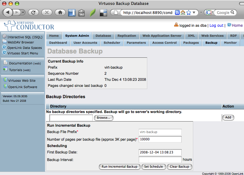 - Subsequent incremental backups can be made from the "System Admin" -> "Backup" Tab of the Virtuoso Conductor by clicking on the "Run Incremental Backup" button.