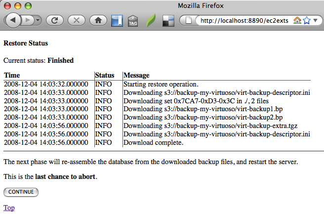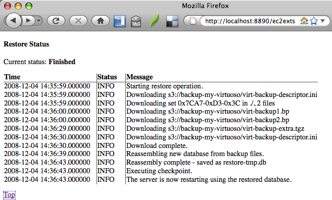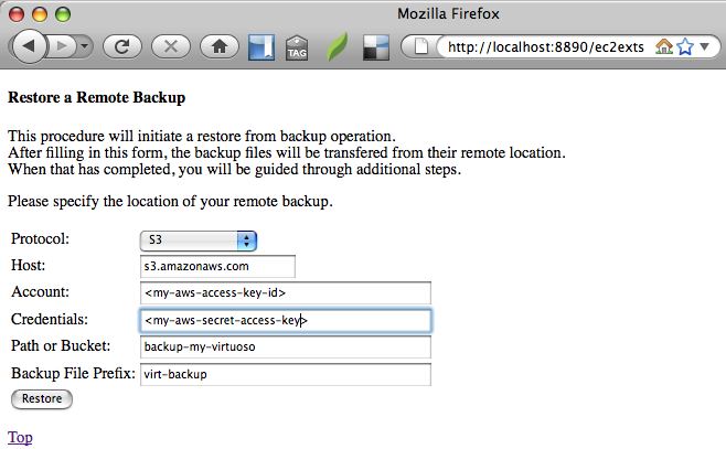 Note: Setting the incremental backup in the Conductor to be performed as a "scheduled" backup, will result in the backup set being automatically uploaded to S3. - To Restore an EC2 S3 online backup go back to the Virtuoso Extensions for Amazon EC2 (