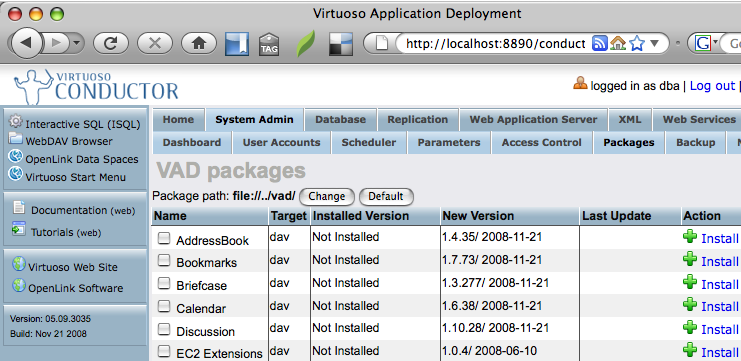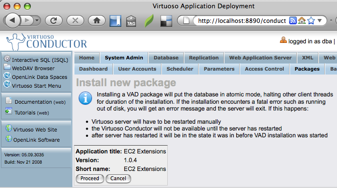 - Select the EC2 Extension VAD from the "System Admin" -> "Packages" Tab of the Virtuoso Conductor and Click the "Install" button.