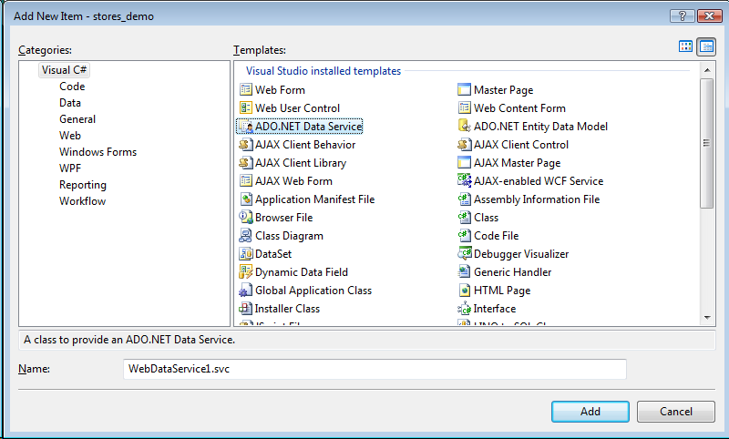 Give it the name WebDataService.svc, and click Add to create the ADO.NET Data Service.