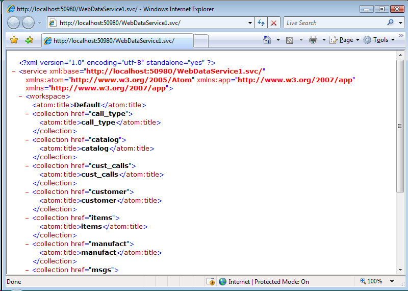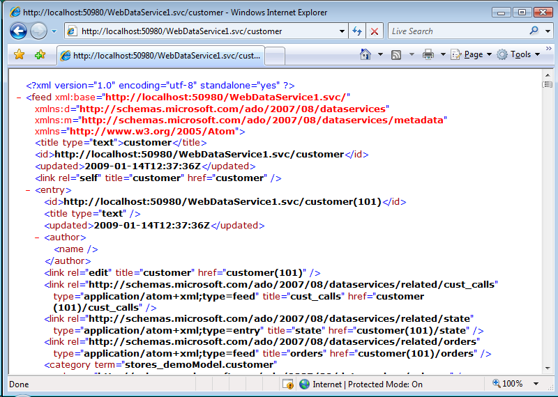 Important - To view Atom (the default format returned by an ADO.NET Data Service) in Internet Explorer, you must first ensure that Feed Reading View is turned off.