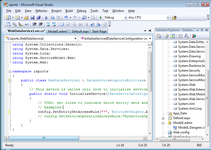 - In the newly created WebDataService1.svc.cs file, add the data source class name of isportsEntities (note this is the name set in the Creating EDM in Visual Studio 2008 section) as the