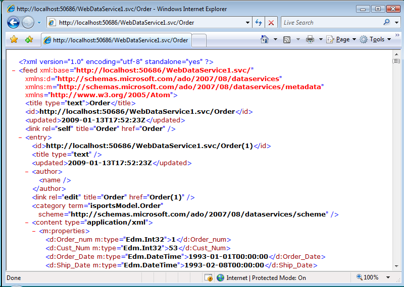 Important - To view Atom (the default format returned by an ADO.NET Data Service) in Internet Explorer, you must first ensure that Feed Reading View is turned off.