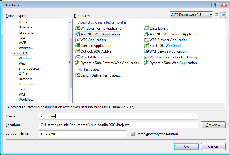 - Within the language category click on Web, and select ASP.NET Web Application from the right-hand panel.