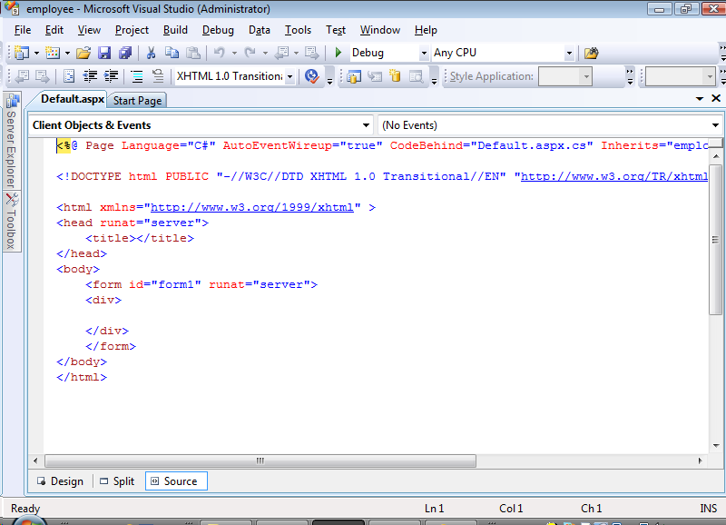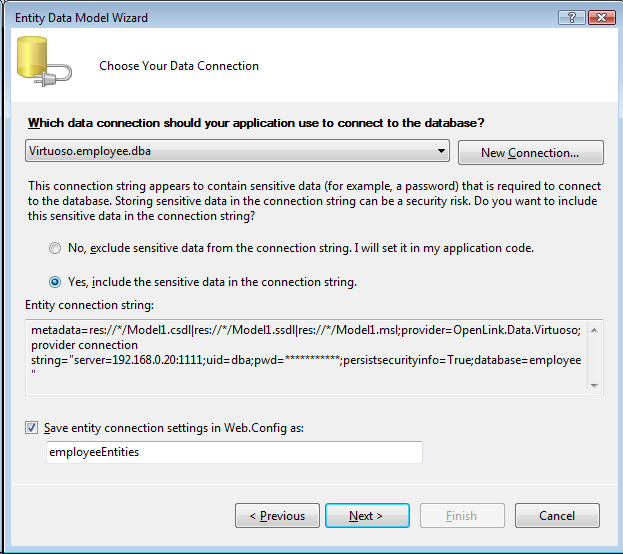 - Set the entity connect string name to employeeEntities (note this name as it is required in the section on creating and ADO.Net Data Service) and click Next.