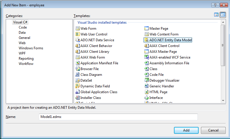 - The Add New Item dialog will appear, choose the ADO.NET Entity Data Model template, give it the name Model1.edmx and click Add to start the creation of the ADO.Net Entity Data Model.
