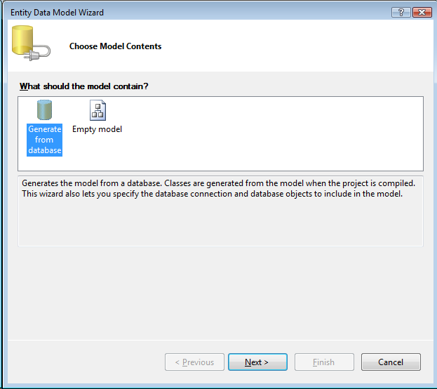 - In the Entity Data Model Wizard dialog Choose Model Contents page select the Generate from Database model type and click Next.