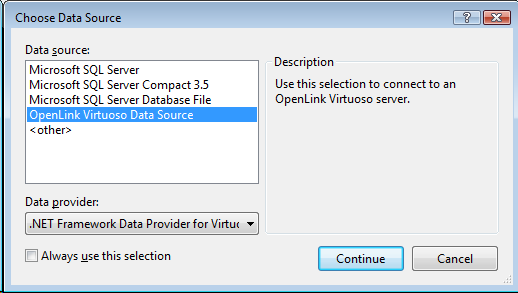 OpenLink Virtuoso Data Source from the list displayed and click Continue.