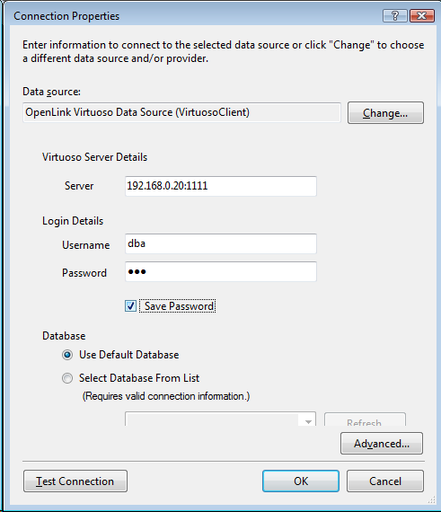 - In the Connection Properties dialog specify the hostname, portno, username and password for the target Virtuoso Server and check the Save Password check box.
