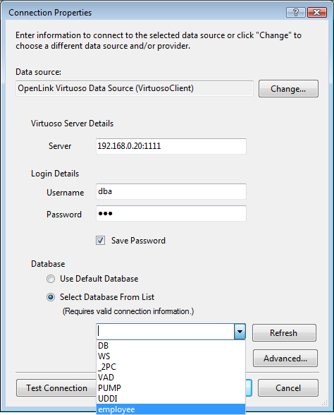 - Select the Select Database From List radio button and choose employee from the drop down list
