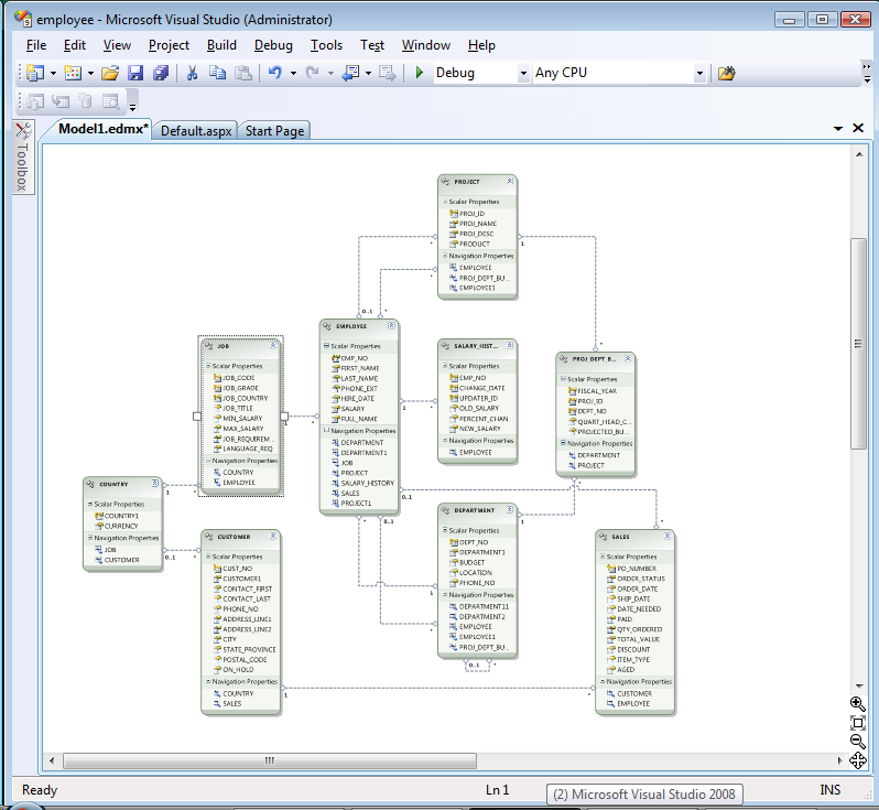 - The Model1.edmx EDM will be created with the tables and relationships displayed in the Visual Studio IDE