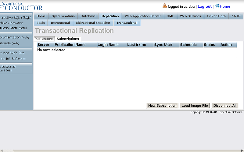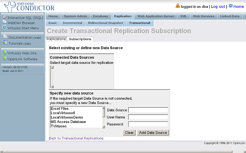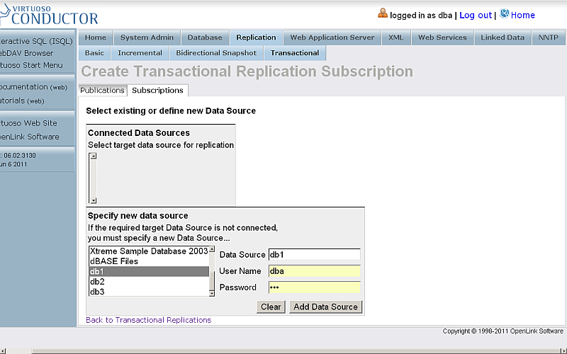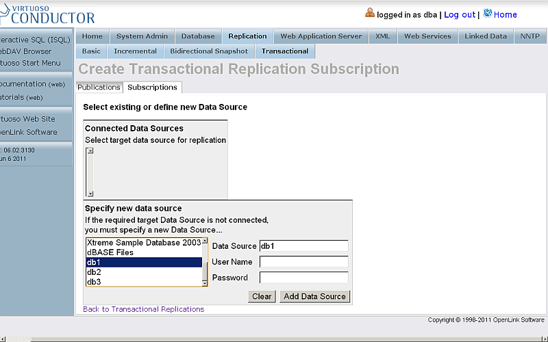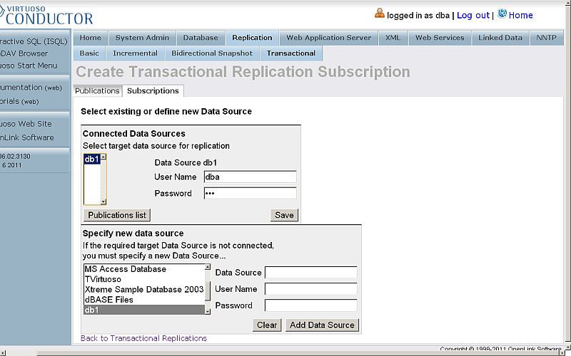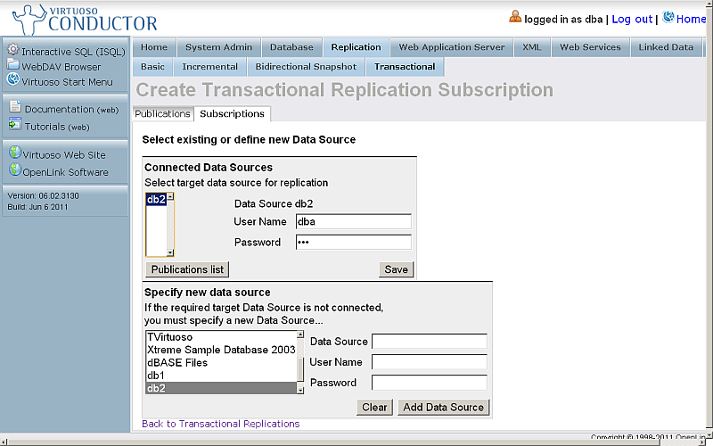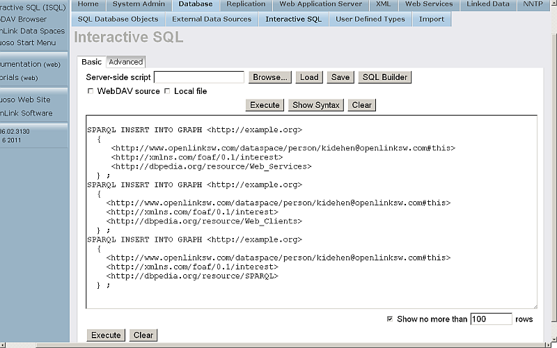 - On the Host Virtuoso Instance db1 go to Conductor -> Database -> Interactive SQL enter the following statement: