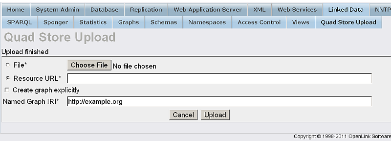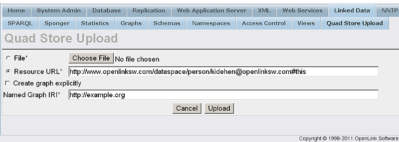 - Go to Linked Data-> Quad Store Upload: