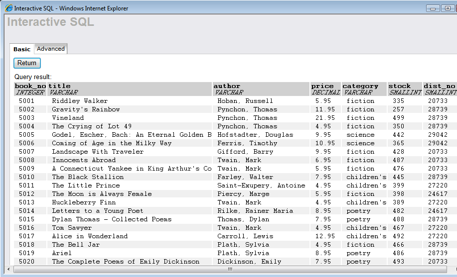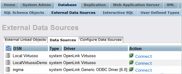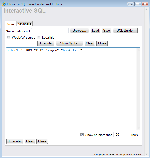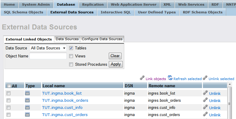 11. The linked tables can be queried by clicking on the hyperlink in the Local Name column of the External Linked Objects tab above. This loads the Virtuoso Interactive SQL interface with the required SQL Select for retrieving the remote table data . We shall use the TUT.ingma.book_list table to demonstrate this.