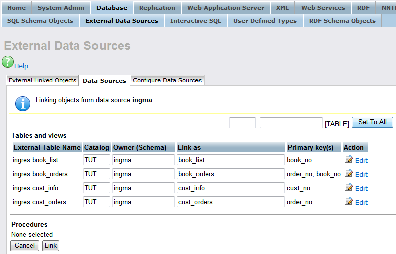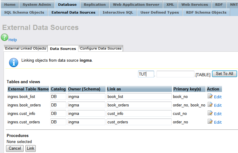 6. Select all the tables that are part of the TUT catalog, and press the Link button to commence the linking process.