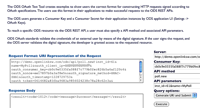The following example demonstrates adding and getting poll by the ODS REST APIs poll.new and poll.get using the OAuth Test Tool. Full list of the ODS REST APIs for ODS Polls you can find here.