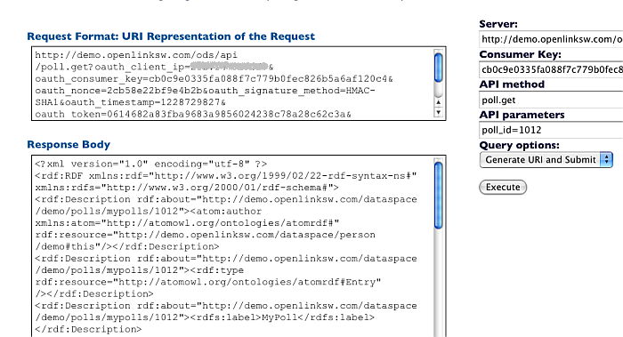 Polls OAuth REST API Example performed with the Virtuoso OAuth Testing Tool