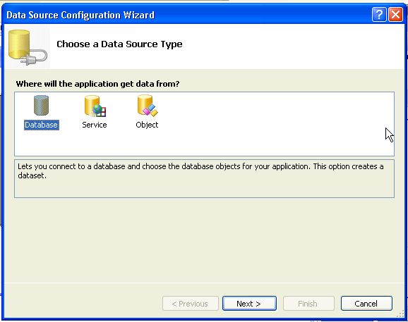 9. In the Data Source Configuration Wizard dialog Choose Data Source Type page, select the Database data source type and click Next.