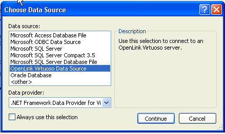11. In the Choose Data Source dialog, select the OpenLink Virtuoso Data Source from the list and click Continue.
