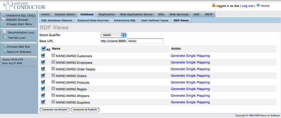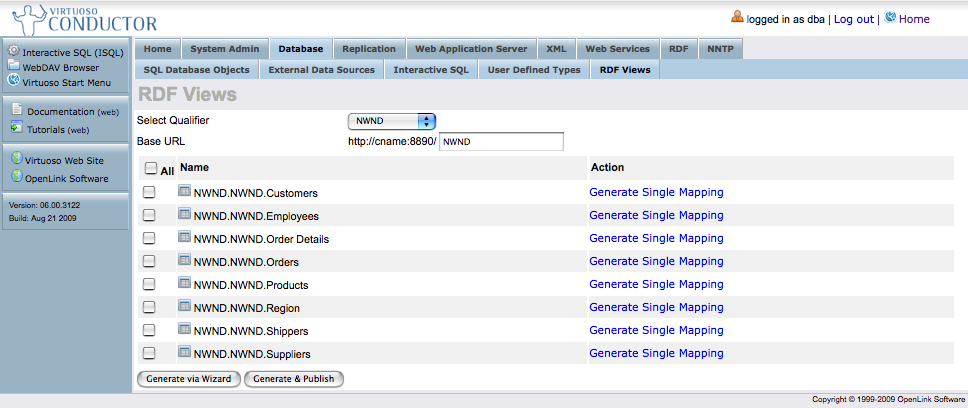 - Choose Generate via Wizard to perform a custom generation and continue with Step 9 or choose Generate & Publish to perform a one click generation of the RDF Linked Data Views, in which case skip to Step 17.