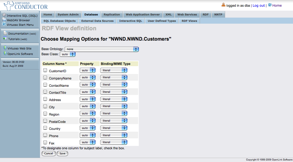 http://<cname>:port/conductor). Note, the appropriate cname (hostname) and port number for dereferencing URIs must be set for theURIQA:DefaultHostVirtuoso configuration parameter before creating the Linked Data Views. - Log in as user