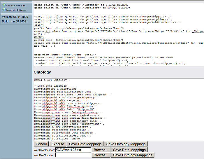 Note, the WebDAV resource path value will be shown in the WebDAV location field. - Then click the "Save Data Mappings" or "Save Ontology Mappings" button, to complete the option task of saving your generated (or edited) view declarations.