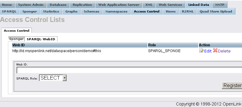 dba. - Drill down to to Linked Data -> Access Controls -> SPARQL-WebID.