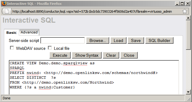 CREATE VIEW Demo.demo.sparqlview AS SPARQL PREFIX nwind: <http://demo.openlinksw.com/schemas/northwind#> SELECT DISTINCT ?s FROM <http://demo.openlinksw.com/Northwind> WHERE { ?s a nwind:Customer }