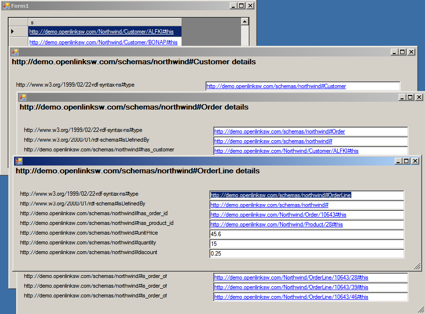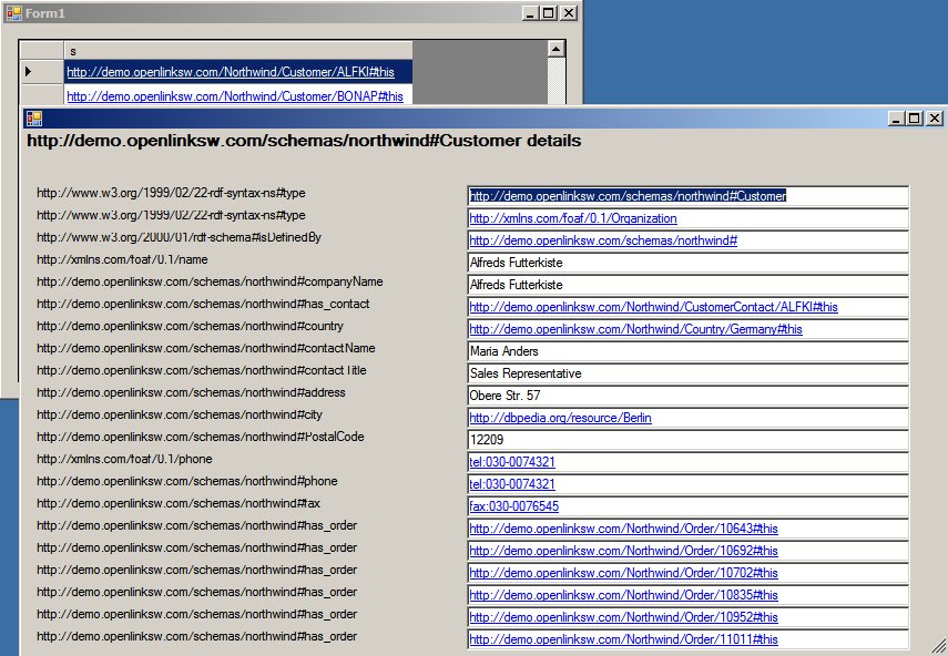 StringBuilder DescribeCommand; VirtuosoConnection ParentConnection; List<Label> labelList = new List<Label>(); List<TextBox> textBoxList = new List<TextBox>(); DescribeDataSet describeDataSet = new DescribeDataSet(); Boolean isIRI = false; public ExtendedStringHandler(SqlExtendedString iri, VirtuosoConnection parentConnetion) { ParentConnection = parentConnetion; if (iri.IriType == SqlExtendedStringType.IRI) { isIRI = true; DescribeCommand = new StringBuilder("sparql SELECT * FROM <http://demo.openlinksw.com/Northwind> WHERE {<" + iri.ToString() + "> ?p ?o}"); // Replace demo.openlinksw.com in line above with your URIQA DefaultHost setting } } public string describeCommandText { get { return DescribeCommand.ToString(); } } public void getDescribeData() { VirtuosoCommand myCommand = new VirtuosoCommand(this.describeCommandText, this.ParentConnection); VirtuosoDataAdapter myAdapter = new VirtuosoDataAdapter(); myAdapter.SelectCommand = myCommand; myAdapter.Fill(describeDataSet.DataTable1); } public void displayData() { if (isIRI) { getDescribeData(); Form describeForm = new Form(); describeForm.AutoScroll = true; describeForm.Width = 840; Label label1 = new Label(); label1.AutoSize = true; label1.Font = new Font(label1.Font.FontFamily, label1.Font.Size + 3.0F, label1.Font.Style | FontStyle.Bold, label1.Font.Unit); describeForm.Controls.Add(label1); DataTable table1 = describeDataSet.Tables[0]; if (table1.Rows.Count == 0) label1.Text = "No Details Available"; else { foreach (DataRow row in table1.Rows) if (row[0].ToString() == "http://www.w3.org/1999/02/22-rdf-syntax-ns#type") { StringBuilder title = new StringBuilder(row[1].ToString() + " details"); label1.Text = title.ToString(); break; } foreach (DataRow row in table1.Rows) { Label propertyLabel = new Label(); TextBox valueBox = new TextBox(); valueBox.Width = 400; object property = row[0]; object value = row[1]; if (value is SqlExtendedString) { valueBox.ForeColor = Color.Blue; valueBox.Font = new Font(valueBox.Font.FontFamily, valueBox.Font.Size, valueBox.Font.Style | FontStyle.Underline, valueBox.Font.Unit); } propertyLabel.Text = row[0].ToString(); propertyLabel.AutoEllipsis = true; propertyLabel.AutoSize = false; propertyLabel.Width = propertyLabel.PreferredWidth > 380 ? 380 : propertyLabel.PreferredWidth; Binding bind = new Binding("Text", row[1], ""); valueBox.DataBindings.Add(bind); labelList.Add(propertyLabel); textBoxList.Add(valueBox); } for (int i = 0; i < table1.Rows.Count; i++) { textBoxList[i].Click += new EventHandler(this.iri_Click); labelList[i].Location = new Point(10, i * 20 + 50); textBoxList[i].Location = new Point(400, i * 20 + 50); describeForm.Controls.Add(labelList[i]); describeForm.Controls.Add(textBoxList[i]); } describeForm.Height = labelList.Count * 20 + 100 > 500 ? 500 : labelList.Count * 20 + 100; } describeForm.ShowDialog(); } else { Form blankForm = new Form(); Label label1 = new Label(); label1.Text = "Blank Node"; label1.Font = new Font(label1.Font.FontFamily, label1.Font.Size + 3.0F, label1.Font.Style | FontStyle.Bold, label1.Font.Unit); blankForm.ShowDialog(); } } public void iri_Click(object sender, EventArgs e) { int boxNum = 0; for (int i = 0; i < textBoxList.Count; i++) { if (sender == textBoxList[i]) { boxNum = i; break; } } Object o = describeDataSet.DataTable1.Rows[boxNum][1]; if (o is SqlExtendedString) { SqlExtendedString se = (SqlExtendedString)o; ExtendedStringHandler seHandler = new ExtendedStringHandler(se, ParentConnection); seHandler.displayData(); } else if (o is SqlRdfBox) { //doesn't do anything at the moment } }