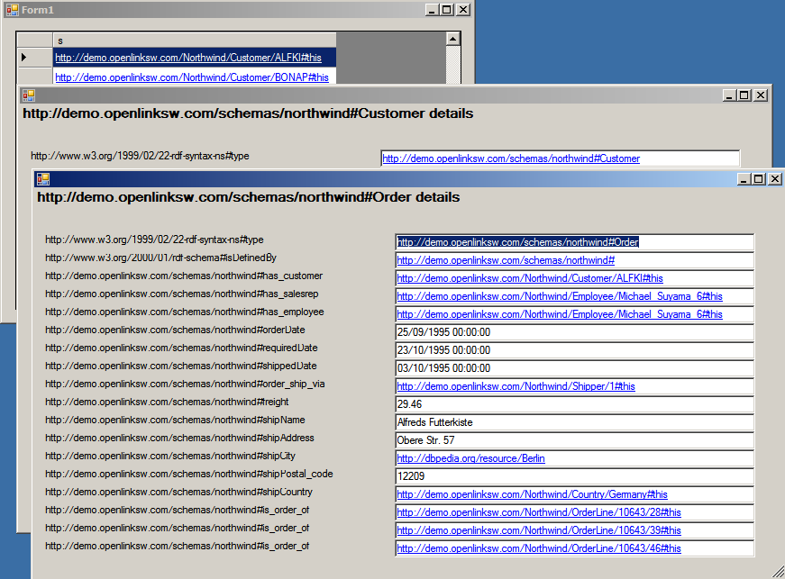 You will notice if you keep clicking on the links that this application will only display data that is held in the Northwind graph. Clicking on an external link, for example the link to Berlin in dbpedia, http://dbpedia.org/resource/Berlin, results in a empty window and an error message. The next step is to extend this application so that it can handle dereferencing external IRIs.