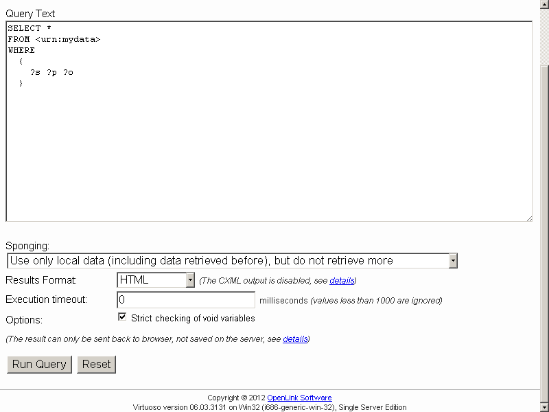 SELECT * FROM <urn:mydata> WHERE { ?s ?p ?o }