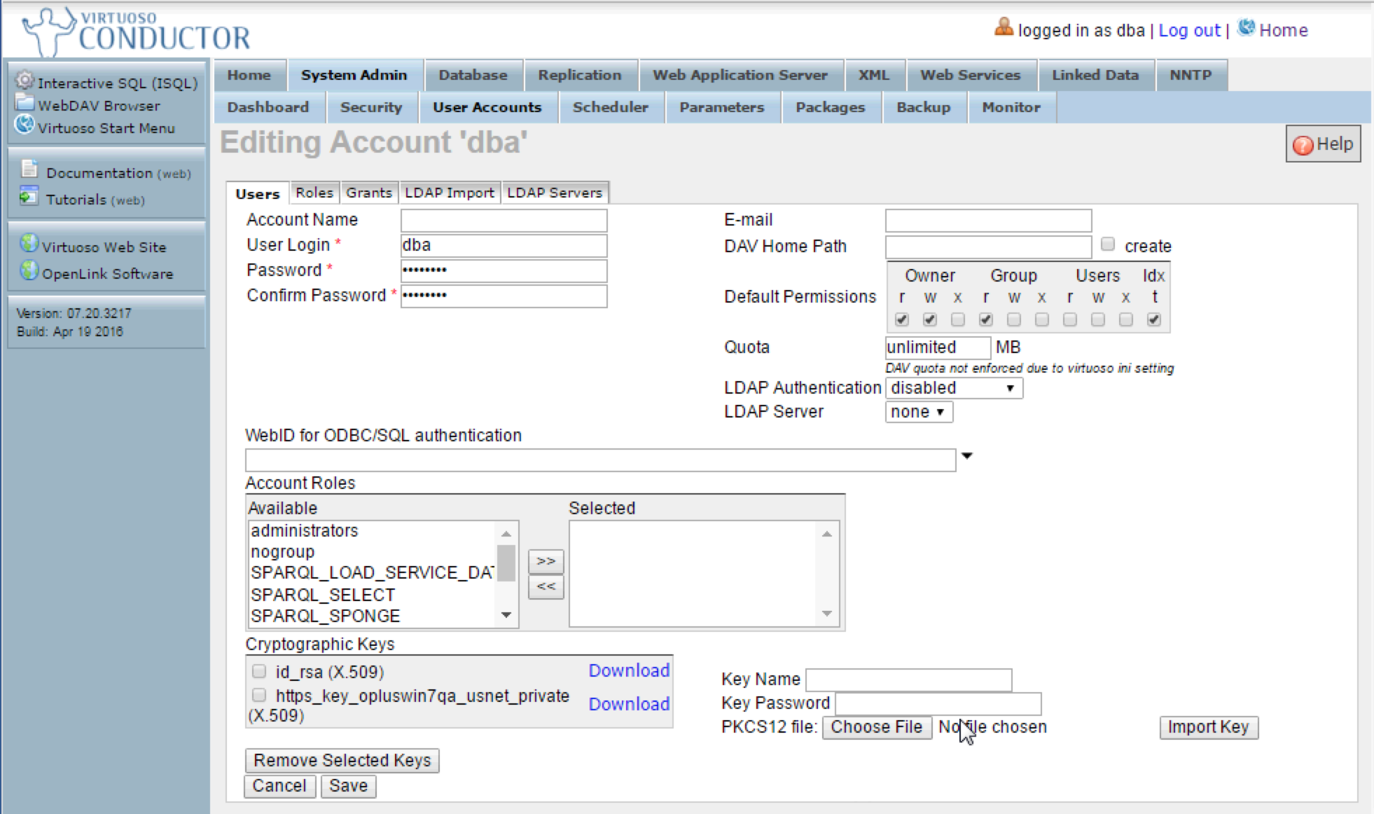 First the Public Key (PEM file) for the Virtuoso self-signed certificate created previously when performing the Virtuoso TLS Setup needs to be downloaded from the dba user account.