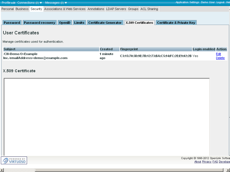 4. Enter in the "X.509 Certificate" text-area the content of the generated from above "Demo.pem":