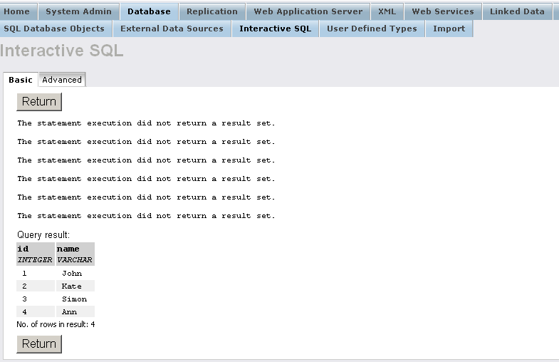 DROP TABLE EXAMPLE_DATA; CREATE TABLE EXAMPLE_DATA ( "id" INTEGER, "name" VARCHAR(100), PRIMARY KEY ("id") ); INSERT INTO EXAMPLE_DATA ("id", "name") VALUES (1, 'John'); INSERT INTO EXAMPLE_DATA ("id", "name") VALUES (2, 'Kate'); INSERT INTO EXAMPLE_DATA ("id", "name") VALUES (3, 'Simon'); INSERT INTO EXAMPLE_DATA ("id", "name") VALUES (4, 'Ann'); SELECT * FROM EXAMPLE_DATA;