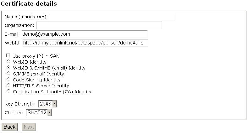 • Leave the select "WebID & S/MIME (email) Identity" radio-box. Another variant is also valid to select the "WebID Identity" radio-box.