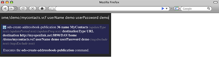 ods-create-addressbook-publication 36 name MyContacts destinationType URL destination http://myopenlink.net:8890/DAV/home/demo/mycontacts.vcf userName demo userPassword demo